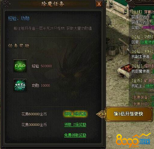 最一开始肯定是跟着主线任务走,毕竟经验和奖励都是最丰富的,然后到50级左右,领三倍做除魔任务。另外还有一天两次的经验副本,都不可以落下,66级开启封魔副本,氪金的玩家都是选多倍奖励。