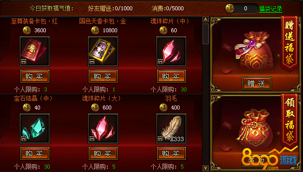 每消费10000元宝可获得1个福袋,福袋可以赠送给公会其他在线玩家,每日最多赠送5个
