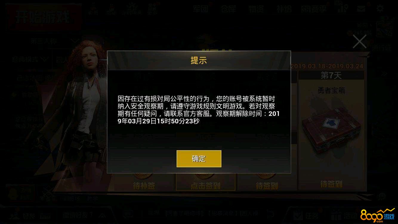 这就是关于2019年刺激战场无限安全观察期解决方法了,目前的话真的出现循环真的就只能换号了,各位玩家在游戏的过程中还是要文明游戏,远离外挂才可以哦。