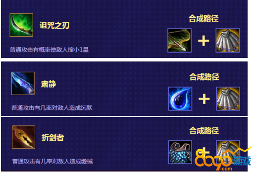 除了阵容克制还可以从装备上去克制,诅咒之刃俗称降星刀,可以把三星爸爸打成一星弟弟,能让拉面熊血量和伤害降低很多。另外肃静的沉默还有折剑者的缴械也很不错,原理差不多,就是让狗熊拉不起来。