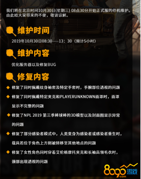 搜索"8090网页游戏"pubg10月30日更新要维护到几点?绝地求生10月30日的维护都更新了什么?pubg在10月30日要进行一次维护更新,下面就给大家带来这次更新的维护时间以及更新内容。