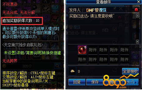 看到这里,没有获得额外奖励不外乎这四种情况:一是打的不是单人普雷,二是没有正确使用光环,把光环放在了幻化栏里,三是没有留意自己的邮件,四就是已经获得了10次奖励。
