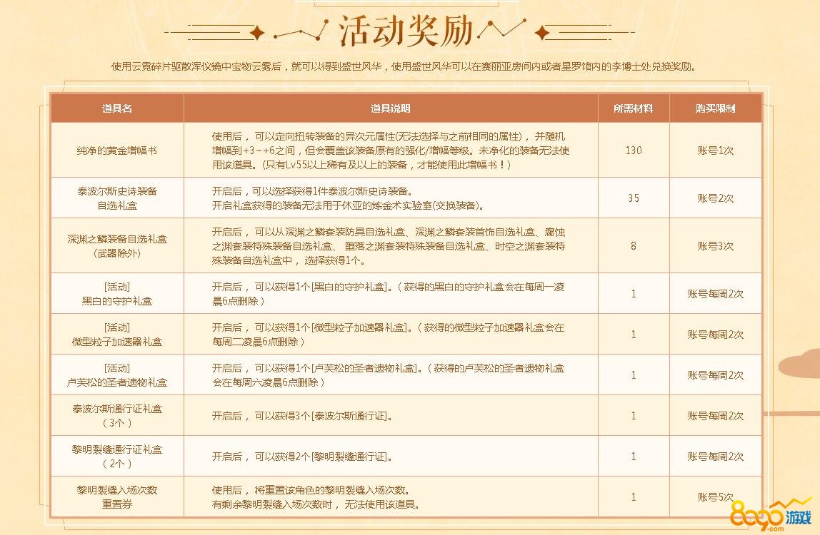 玩家完成了前置任务就正式开始这个活动了,玩家只要通过17级及以上的推荐地下城就可以获得云霓碎片,使用云霓碎片驱散浑仪镜中的云雾后就可以获得盛世风华了,获得盛世风华可以在李博士处兑换共计9款道具奖励,包含了纯净的环境增幅书、泰波尔史诗装备、深渊之鳞准备、活动礼盒以及门票等等奖励。