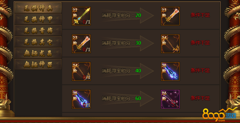 可以兑换的装备有神兵、神甲、首饰、无极龙晶、无极神器以及一些升战力需要的材料等物品。根据材料的稀有程度和等级需要不同的兑换条件和积分,一般神兵、神甲、首饰都是通过低一届的首饰消耗一定的探宝积分兑换高级装备,比如:兑换一把23阶的武器首先需要一把22的武器,然后另外需要20点的探宝积分。探宝积分的主要来源是探宝,每次探宝可以获得一点积分,每次探宝需要消耗200传奇币,探宝是快速获取极品装备的主要途径,也是有钱玩家的玩法,而且游戏内带有探宝活动,活动内探宝是非常的划算的。