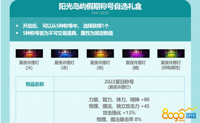 搜索"8090网页游戏"备受玩家们期待的DNF游戏已于6月30日进行了一次全区全服的停机更新,随着新版本的更新,dnf官网也迎来了很多惊喜活动,很多玩家都想知道dnf2022夏日称号外观怎么样?dnf夏夜许愿灯称号属性是什么?dnf2022夏日称号怎么获得?今天小编就带来dnf2022夏日称号外观属性,感兴趣的小伙伴一起来了解一下吧!