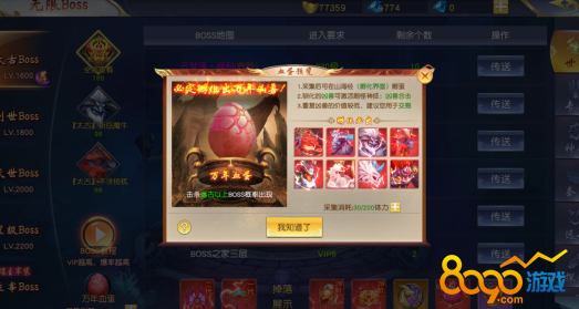 仙侠神域我们的凶兽可以再无限boss中掉落,无限boss进入方式在我们的主界面右上角。进入无限boss界面之后要点击帝级boss进行击杀,只有在击杀帝级及以上的boss才有概率掉落血蛋。采集血蛋需要消耗体力,采集越高等级的血蛋消耗的越多。