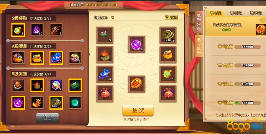 2、90元宝(2次)*5次抽奖=450元宝20宝石, 加免费次数获得总30宝石