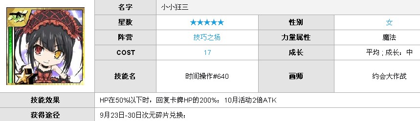 百万亚瑟王小小狂三的技能效果还是蛮不错的,尤其是在10月活动期间,还能有2倍ATK,HP在50%以下时,回复卡牌HP的200%。另外也是一个具备操控时空神奇能力的卡牌。
