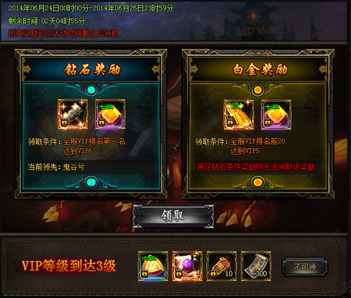活动内容:活动时间内,VIP排行榜前20的玩家并达到活动要求可获得丰厚奖励,VIP等级达到3级的所有玩家均可领取坐骑奖励。