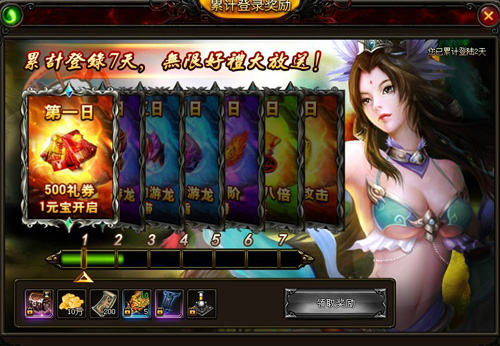 活动内容:只需登录即可领取累计登录礼包,累计登录满七天即可集齐完美套装、本职业超强+5武器。