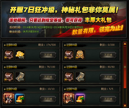 活动内容:活动期间,只要达到指定等级,即可领取冲级大礼包。(礼包数量有限,领完为止)