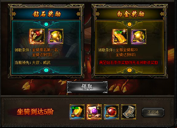 活动内容:活动时间内,坐骑排行榜前20的玩家并达到活动要求可获得丰厚奖励,坐骑达到5阶的所有玩家均可领取坐骑奖励。
