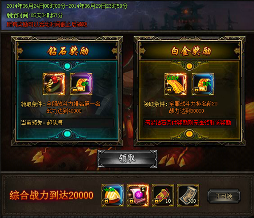 活动内容:活动期间,战力排名前20的玩家并达到活动要求可获得丰厚奖励;综合战力达到20000的所有玩家均可领取战力奖励。