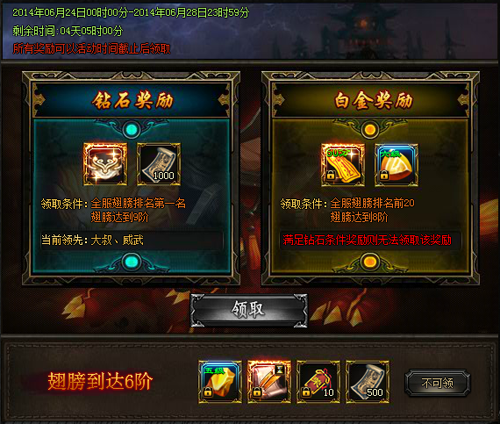 活动内容:活动时间内,翅膀排名前20的玩家并达到活动要求可获得丰厚奖励,翅膀达到5阶的所有玩家均可领取翅膀奖励。