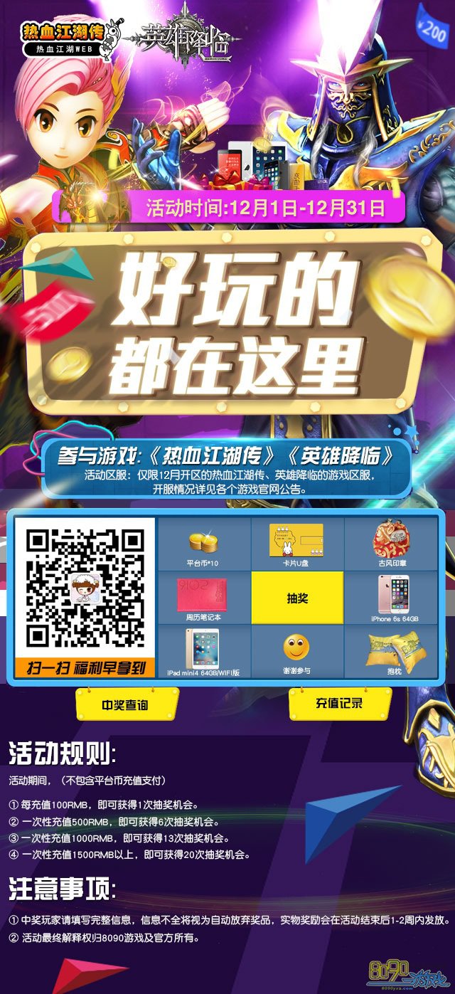 8090游戏热血江湖传、英雄降临两大游戏携手共渡浓情11月,自2015年12月1日-31日,凡是充值满100的玩家均可参与微信抽奖活动,多充多送,更有神秘大奖等你抱回家!