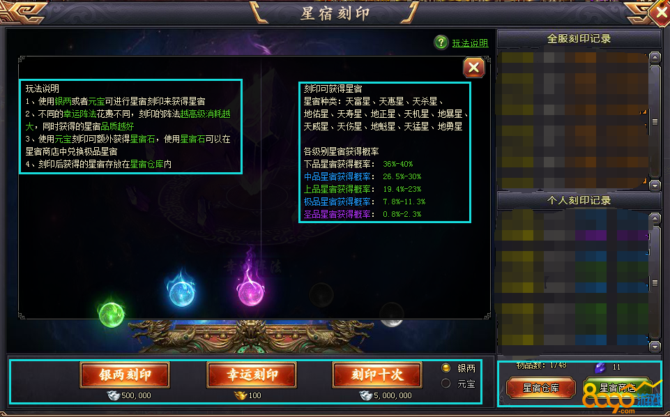 b. 星宿刻印消耗银两和元宝,刻印出不同的星宿。