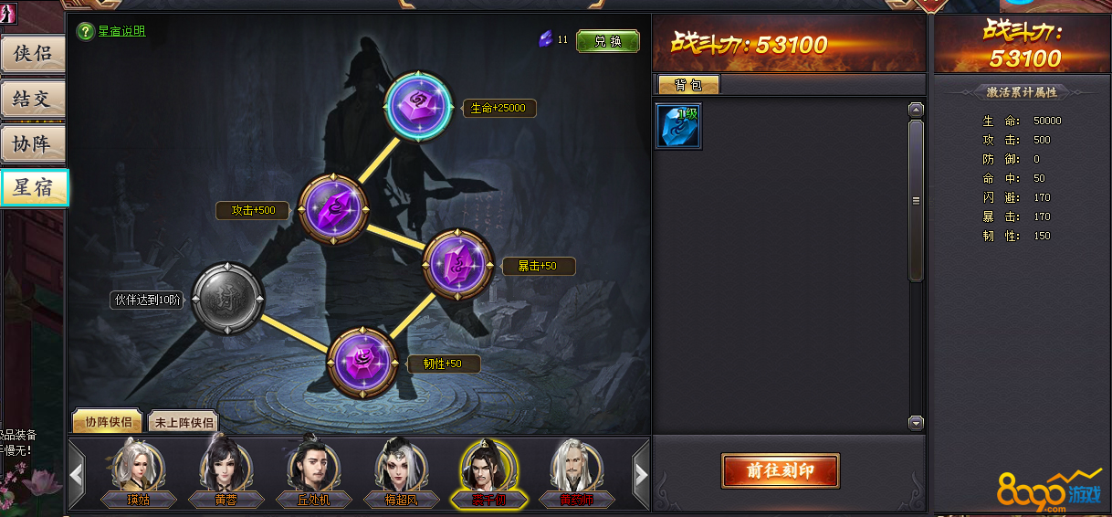 e.星宿可以镶嵌在上阵的侠侣身上,镶嵌后属性直接加成到人物身上,装在未上阵的侠侣上时,属性不会加成在人物身上。