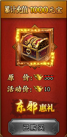 东邪惠礼:累计充值一千元宝,可以花十元宝购买原价三百八十八元宝的八个珍品丹三享包(三)。珍品丹可以用来进阶6阶以上的暗器,阵法,异兽。