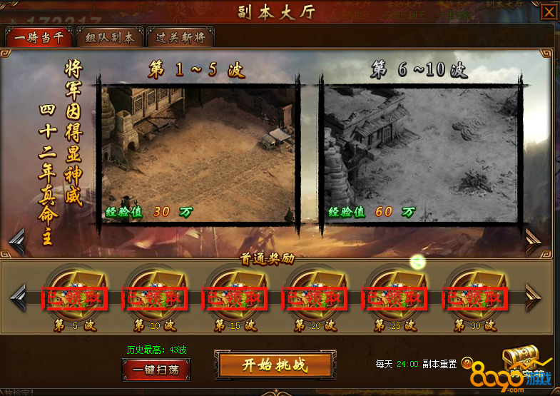 8090三国令一骑当千副本中每天可以多次进入,一共有300波怪。通过一键扫荡可直接扫荡至历史最高波数,每天凌晨24点重置。每5波会获得通过宝箱,在限定时间内通关副本可获取巨额经验奖励,通过击杀特定波数的守将还将获得极品装备。副本页面右边还有玩家通关排行,可以直观清楚的知道自己的实力。