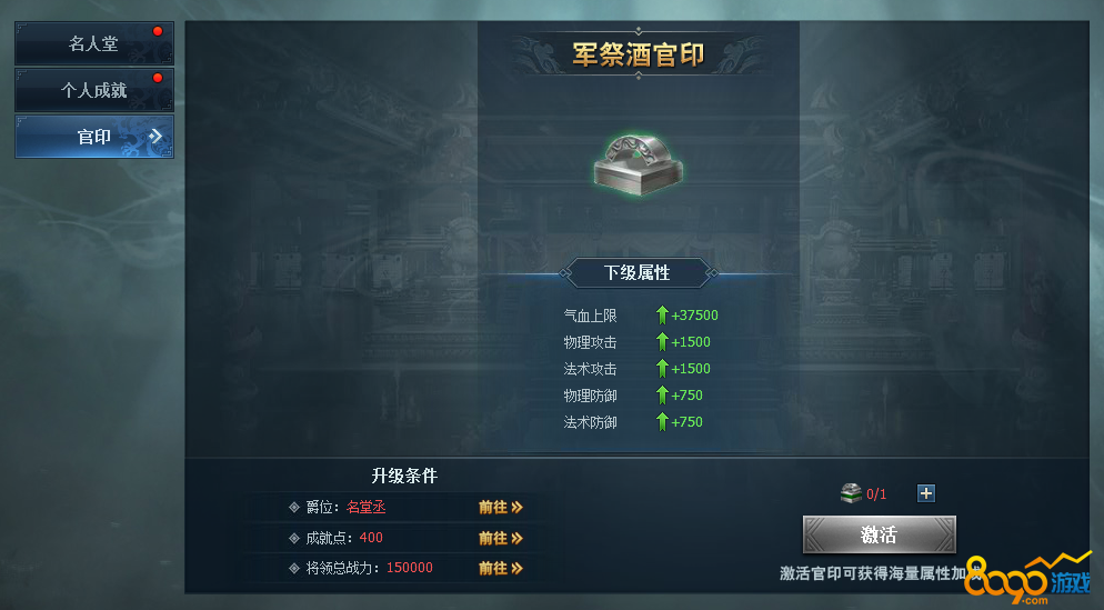 8090《三国群英传》玩家们在游戏中可以升级自己的官印,为所有武将提供大量属性加成,官印级别越高,加成属性越多。升级官印需要达成指定的爵位、战力、成就点数等条件,升级时消耗指定的官印道具即可成功升级。