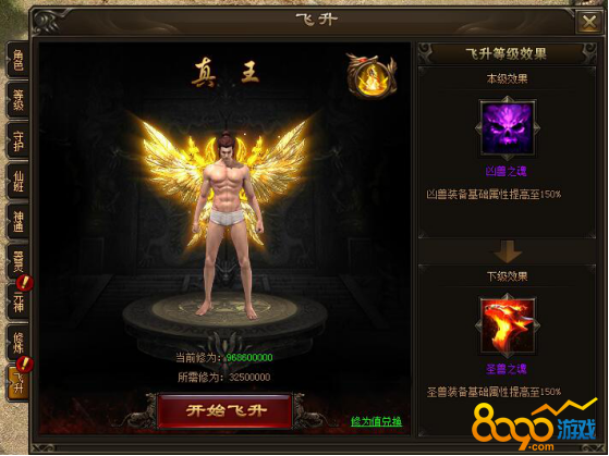 飞升系统是在人物角色面板中,只有开服达到20天,人物等级到达450级才可以出现飞升系统,升级飞升等级需要消耗一定的飞升修为,飞升修为可以通过元宝兑换以及在限购商城中购买。飞升系统可以提升器灵装备器灵装备,全部守护装备,全部戒灵装备,全部屠魔装备以及凶兽装备和圣兽装备圣兽装备的基础属性,飞升等级越高,提升的基础属性加成也越多。