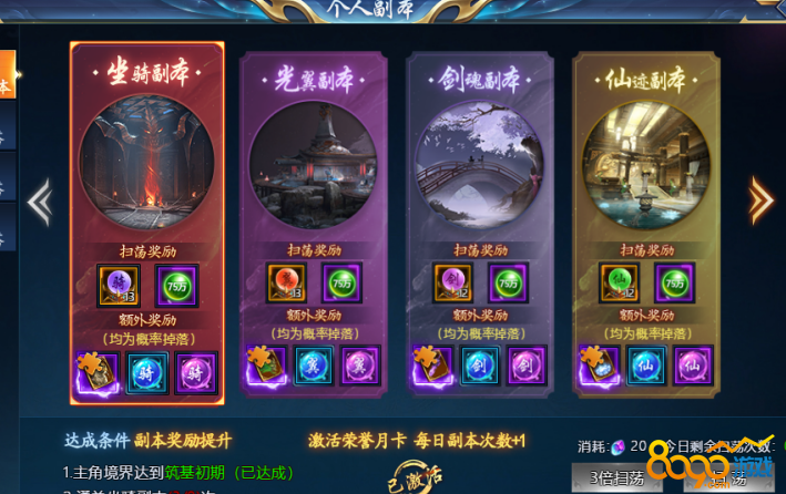 材料副本每种每日只能进入2次,千万不要错过。激活荣誉月卡,每日副本次数+1哦