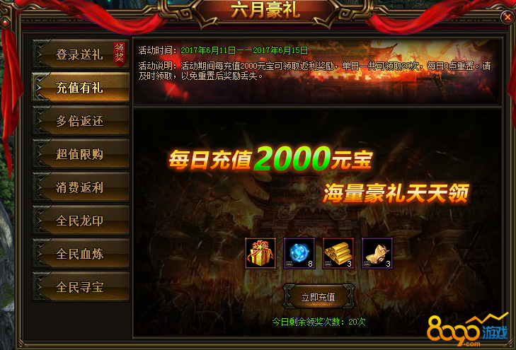 2、活动说明:活动期间每充值2000元宝可领取返利奖励,单日一共可领取20次,每日0点充值,请及时领取,以免充值后奖励丢失