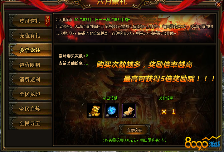 2、活动说明:活动期间每日可花费888元宝购买超值绑元及材料,每日限购买1次,活动时间内购买次数越多,获得奖励倍率越高,连续5天,则第5天可获得5倍奖励