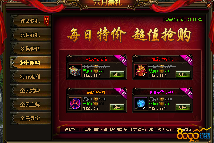 2、活动说明:活动期间,每日0点刷新特价珍贵道具