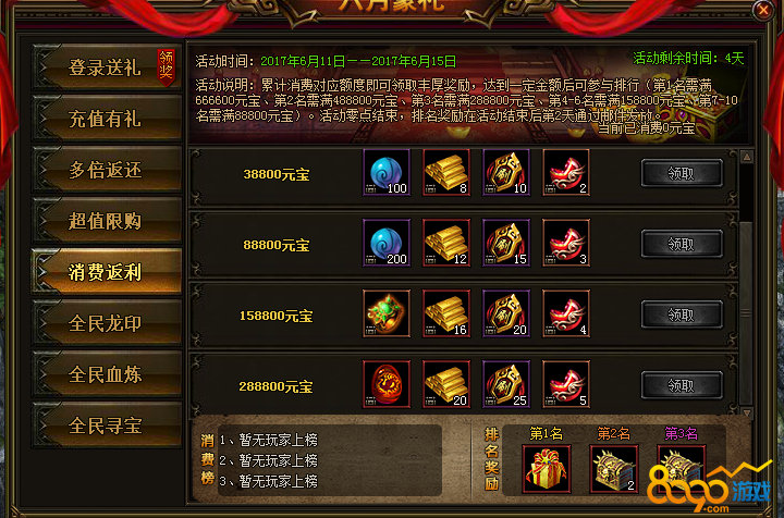 2、活动说明:累计消费对应额度可领取丰厚奖励,达到一定金额后可参与排行(第一名需满666600元宝,第二名488800元宝,第三名288800元宝,4-6名1588800元宝,7-10名88800元宝)。活动零点结束,排名奖励在活动结束后第二天通过邮件发放。