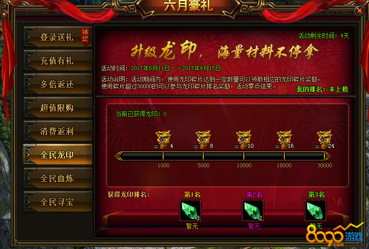 2、活动说明:活动期间,使用龙印碎片达到一定数量可以领取相应的奖励,使用碎片超过30000的可以参与龙印碎片排名奖励,活动零点结束。