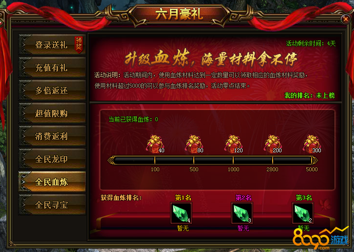 2、活动说明:活动期间,累积使用血炼材料可以领取额外珍贵道具,达到一定额度还可以参与排行,排行奖励在活动结束第二天通过邮件发放。