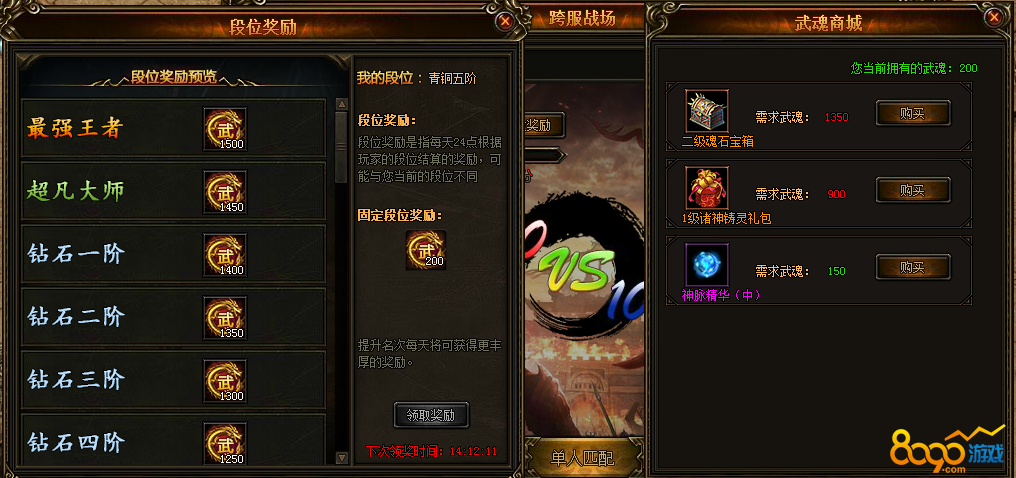 在天地诸神跨服战场中,玩家的初始段位是黄铜五,也是蹭了一把英雄联盟的热度,最高段位是最强王者。游戏暂时只推出了单人匹配模式,后面是否会开放组队匹配还有待确认。在战场内击杀敌方,占领水晶塔、击破敌方伏魔塔都可以获得积分,战场内死亡不掉落装备,先达到1000积分的一方获得胜利或时间结束时积分高的一方胜利,每场根据玩家个人积分获得对局奖励。胜利将会获得段位的提升,失败则会扣除相应的段位分。段位越高,每日获得的奖励将越丰厚。每天跨服战场只能参与5次哦。玩家达到相应的段位每天可以获得固定的武魂,每场匹配结束也会按照游戏内的排名奖励武魂。玩家可以用武魂在武魂商城中购买魂石宝箱,诸神铸灵礼包和神脉精华。