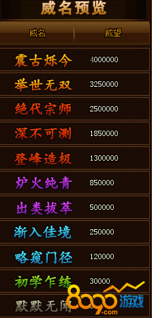 在屠龙战神中威名共有11个等级,最低的是默默无闻,是在角色出生之后就具有的,但默默无闻的等级是不加属性,当我们将威名的等级升到初学乍练之后就开始为角色增加属性了。威名的最高称号是震古烁今。