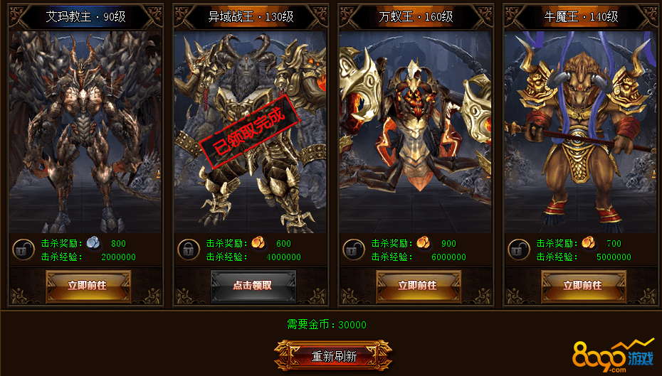限时boss活动是在开服前7天出现的。在限时boss界面会有4个boss,每个boss对应不同积分。积分分为银积分和金积分,击杀想对应的boss就可以获得对应的积分。如果觉得系统刷新的4种boss不是自己满意的,还可以消耗金币进行刷新。刷新的时候可选择全部刷新还是部分刷新。如果是部分刷新的话,只要将不用刷新的boss进行锁定就可以了。