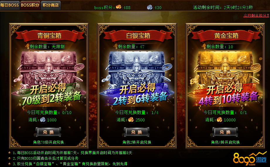 击杀boss所获得的积分可以用来兑换装备宝箱。银积分可以兑换青铜宝箱,金积分可以兑换白银宝箱和黄金宝箱。青铜宝箱可以开出70级到2转的装备,白银宝箱可以开出2转到6转的装备,黄金宝箱可以开出4转到10转的装备。