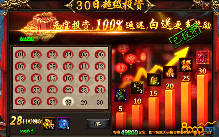 所以这个活动还是相当不错的,在游戏里建议尽早投资参加活动,达到30天赚的可不是一点点哦!