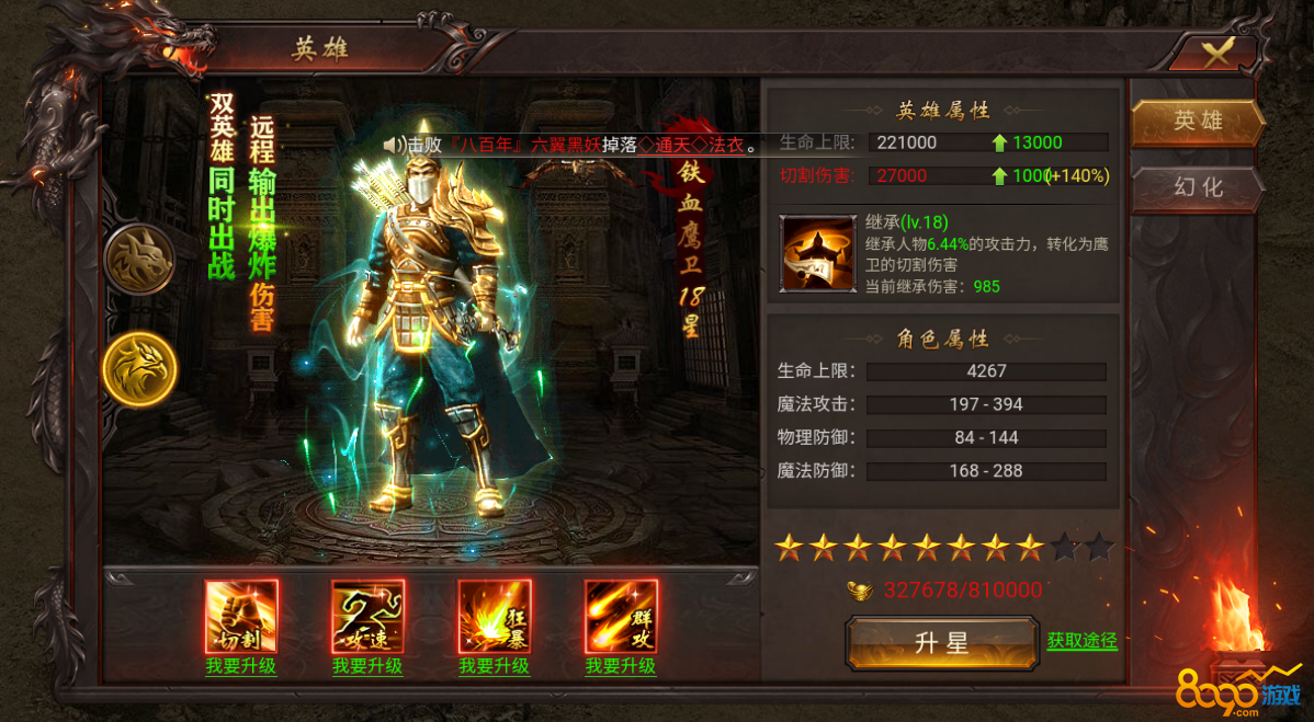 在游戏中,当玩家的角色达到110级的时候,并且完成相应的主线任务之后,就会开启英雄系统了。英雄分为虎卫和鹰卫,两个英雄可以同时出站,虎卫近战抗伤,然后麻痹对手,然后鹰卫远程输出。虎卫主要的技能是:嘲讽BOSS、怪物麻痹、怪物禁止疗伤、英雄复活、增加生命上限。鹰卫主要的技能是:怪物切割、攻速、狂暴、火雨。 而且技能可以直接点击技能下方的获取地址,直接跳转到英雄礼包,根据自身的钻石数量合理购买加成比例高的技能。