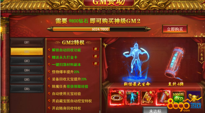 首先,该游戏中的GM等级是需要通过钻石来购买的。而钻石可以通过多种方式获得,包括充值、首杀、爬塔、打金猪以及装备回收等。