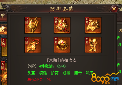 防御装备包括头盔、项链、护符、戒指、腰带、靴子。
