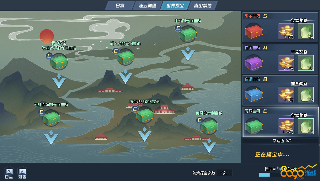 首先,世界探宝不是每日限时活动,这是一个全天都可以参加的活动,每次探宝可以获得15点江湖历练值,没人每天只能参加两次,每探宝一次需要消耗一小时等待探宝时间。探宝的宝箱也是分等级的,分别为S级-紫金宝箱,A级-白金宝箱,B级-白银宝箱,C级-青铜宝箱,宝箱的等级越高,宝盒的奖励也就越高。当然,玩家也可以通过决战来掠夺其他玩家的宝箱,每日每人只有5次掠夺机会,掠夺成功有额外的奖励。