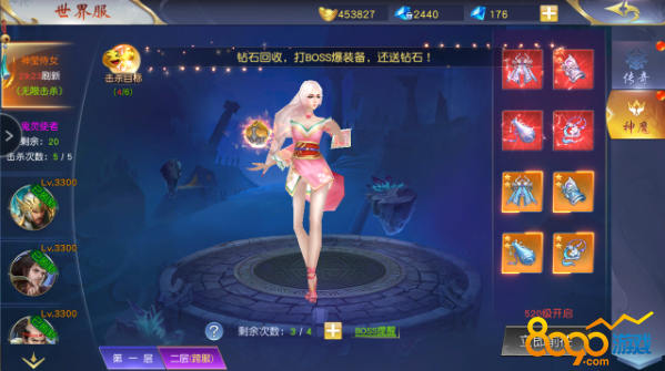 神魔boss共有2层,里面一共有20个神魔,玩家想进入第2层,必须要自身等级达到520级之后才能进入。 神魔boss第二层中的boss为神莹侍女和鬼灵使者,神莹侍女是可以无限击杀的,但是地图中的神莹侍女数量有限,击杀后不再刷新。