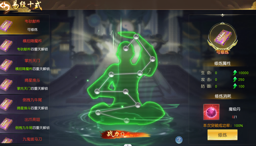 关于仙侠神域奇装内魔域装备的提升攻略,易经十式,魔域四极,这些是属于很多玩家不注重的装备点位,在易经十式里面可以通过魔极丹进行提升。