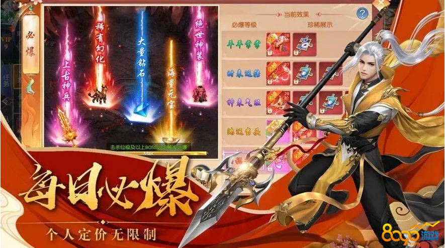 神装抽奖:这是玩家获取高级装备的一种方式,包括抽取99阶神装,这些装备能够提升全身的攻击和生命属性。每进行2000次抽奖会有一个保底出现神装的机制。