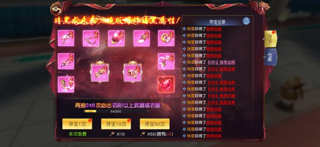 每次寻宝150次,你都有机会获得一件粉色装备,等级范围在31阶到35阶之间。想要这件装备不绑定吗?秘诀就在于使用不绑定的钥匙进行抽取。在抽取前,记得把绑定的钥匙存放在仓库里,确保使用的是不绑定钥匙。这样,你获得的粉色装备也将是不绑定的,可以自由交易或存入仙盟仓库。