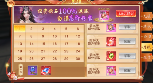 参与月投活动后,玩家可以享受到丰富的签到奖励。每天签到,你都能获得一定数量的材料和钻石。累计签到达到一定天数后,还能领取额外的丰厚奖励。具体来说,购买月投后,第一天签到即可获得28888钻石,接下来的29天每天都能签到获得500钻石,总计可以获得14500钻石。加上第一天的奖励,月投活动期间总共可以获得43388钻石以及若干其他材料。这一钻石数量相较于原价购买,实际上溢出了约32%,性价比相当高。