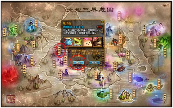 然后再出现的世界地图上寻找自己想去的地点,例如:选择黑风山,然后点击确定,即可瞬间到达黑风山。