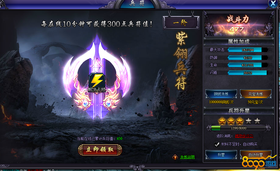 兵符的进阶可提高兵符洗炼属性上限,最大攻击,防御,生命,闪避都会增加。兵符每天有3次免费洗炼的机会,每天24点重置,兵符洗炼有几率提升或降低属性,在洗炼兵符的时候一定要记住,属性提升的时候一定要保存。每天除了三次的免费洗炼的机会以外,还可以用铜钱洗炼和元宝洗炼,铜钱洗炼每次需要消耗1000000铜钱,元宝洗炼每次需要50元宝。每在线十分钟可获得300点兵符值,除了累积的兵符值外,还可以通过战功令来升星,战功令在碧血幽阁里打BOOS掉落。兵符在游戏里是一件是在人物原有的属性基础上,提升人物属性的上限,这样就大大的提高了战斗力。每一阶兵符的升星总共有五颗星,满五颗星以后兵符就会进阶到下一阶。