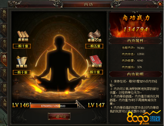 心法系统中一共有4个心法,易筋经,菩提心经,洗髓经和达摩心经,每个心经增加的属性各不相同,分别增加的是内功值,内功攻击,内功回复和内功减伤,心经的经验可以通过击杀心法副本中的BOSS获得。