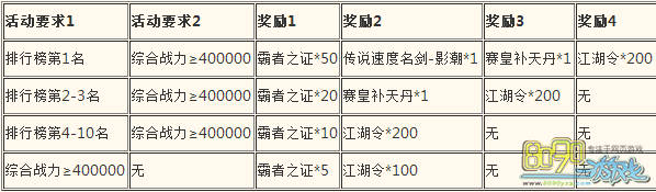 【活动内容】根据综合战力排名给予奖励,开服第五天排行榜结算,综合战力达到一定要求均有奖励,活动结束奖励如未领取,自动邮件发放。